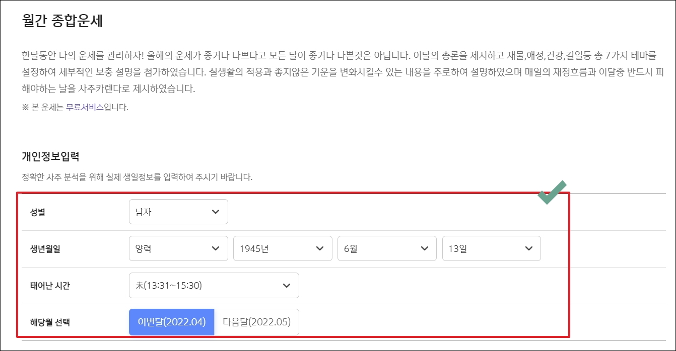 ▼무료 사주 사이트에서 평생 운세 다음으로 볼 만한 것은 월간 종합운세 입니다. 짧은 기간 단위로 나의 사주가 어떠한지 알아보는 데에 적합합니다. 당연히 무료 운세 서비스이고, 재물, 애정, 건강, 길일 등 여러 가지 테마를 다루고 있다고 합니다. 여기에서는 기존 정보에 더하여 해당월을 선택해야 합니다. 다음 달의 나의 사주 풀이 결과를 볼 수 있다는 의미입니다.