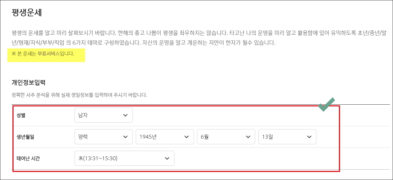 ▼타고난 운명을 알아보기에 적합한 평생운세 서비스를 선택했습니다. 안내 문구를 보면 무료 사주를 볼 수 있다고 명확하게 표시가 되어 있습니다. 안내 문구 다음에는 정확한 사주 분석을 위한 정보 입력을 해야 한다고 나와 있습니다. 성별, 생년월일, 태어난 시각을 정확하게 입력한 후 [운세 보기] 버튼을 클릭합니다.