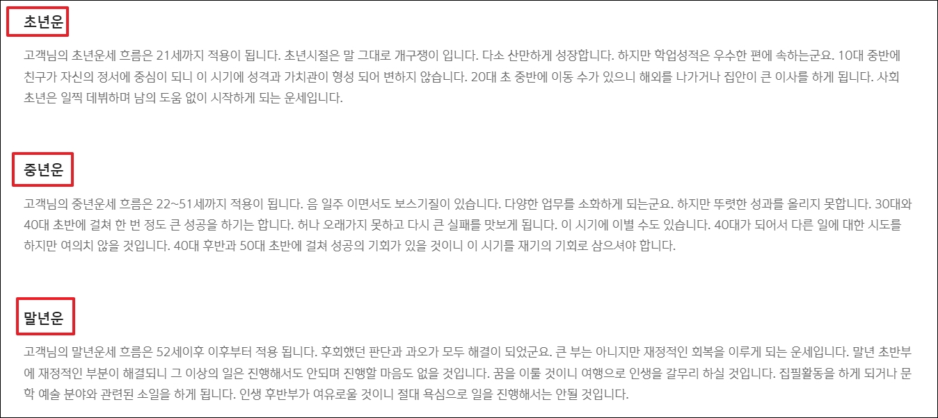 ▼새롭게 페이지가 바뀌면서 나의 초년운, 중년운, 말년운에 대해 쭉 나오고 있습니다. 무료 사주 서비스 임에도 불구하고, 꽤 깊이 있는 내용을 담고 있습니다. 초년, 중년, 말년은 사람마다 그 시기가 다릅니다. 현재 기준으로 제가 보았을 때에는 초년은 21세까지, 중년은 22세부터 51세까지, 말년은 52세부터 적용된다고 나와 있습니다.