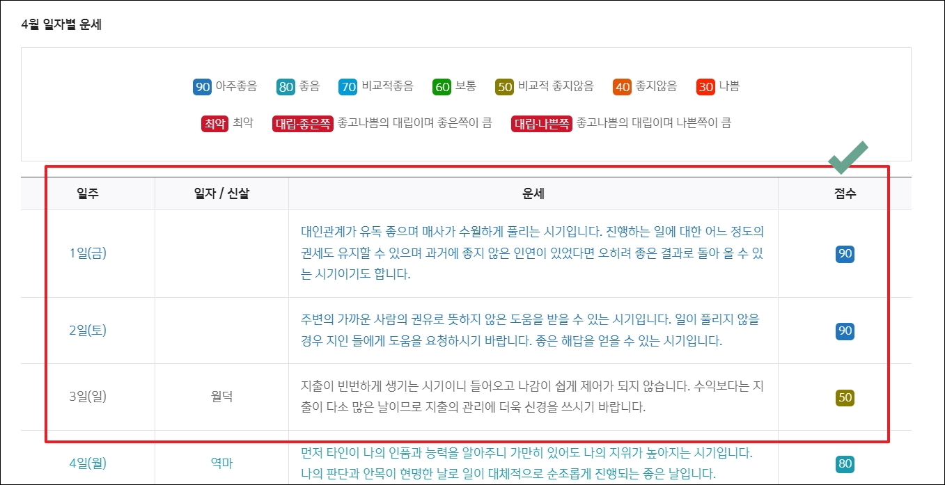 ▼여기서 특징적인 것 위주로만 알려 드리겠습니다. 일자별 운세를 통해 매일 어떤 운이 들어오는지 알아보는 것은 물론이고, 점수를 통해 운이 얼마나 좋은지 또는 나쁜지 알 수 있습니다.