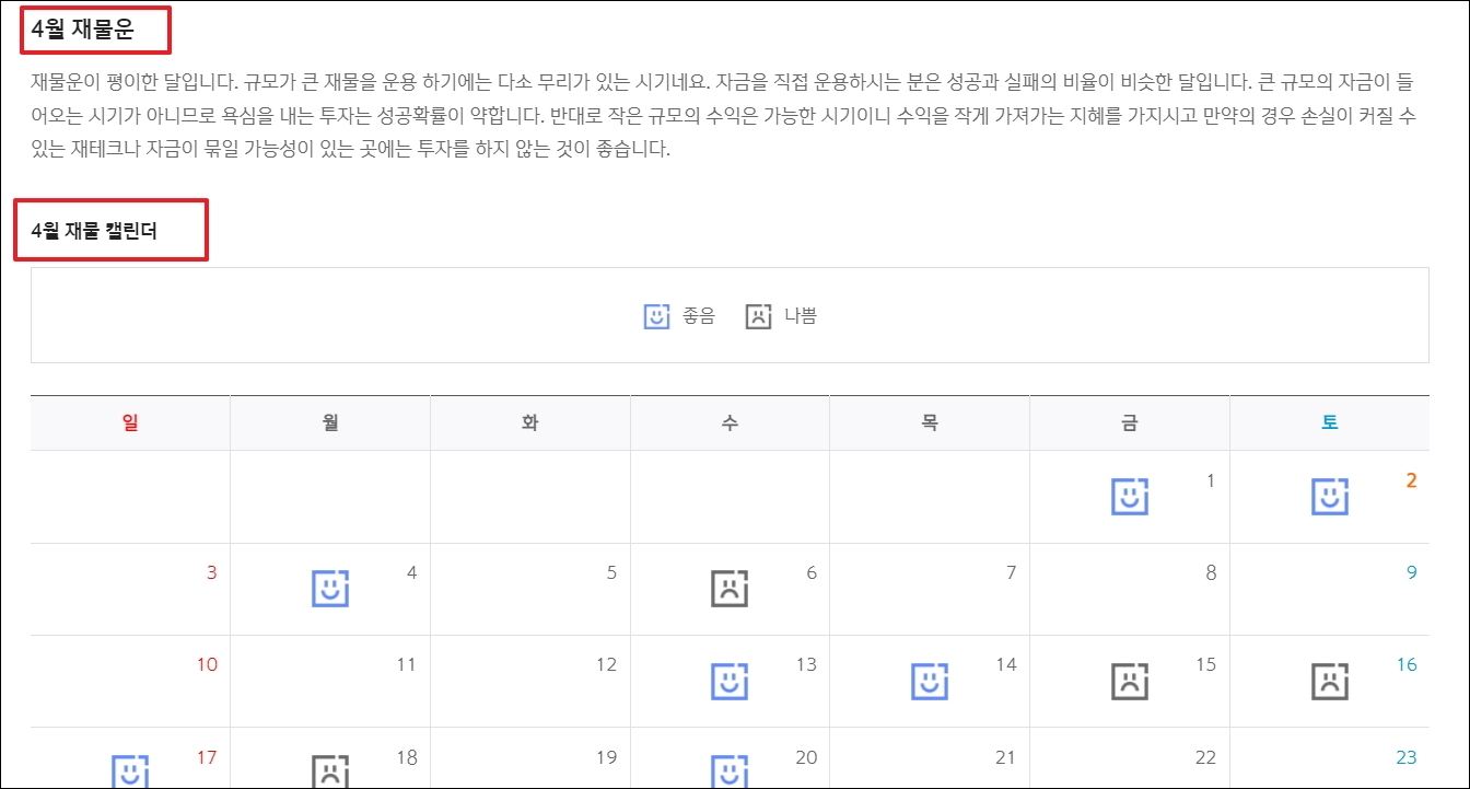 ▼캘린더 형식으로 그날그날 재물, 애정, 취업, 승진에 관련하여 좋은 날인지 나쁜 날인지 알 수 있습니다. 다른 사주 사이트에서 보기 힘든 방식으로 편하게 길일을 찾을 수 있다는 장점이 있습니다.