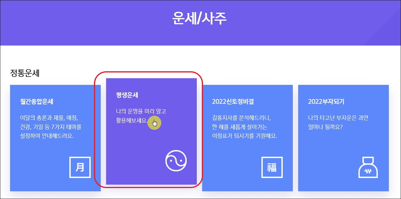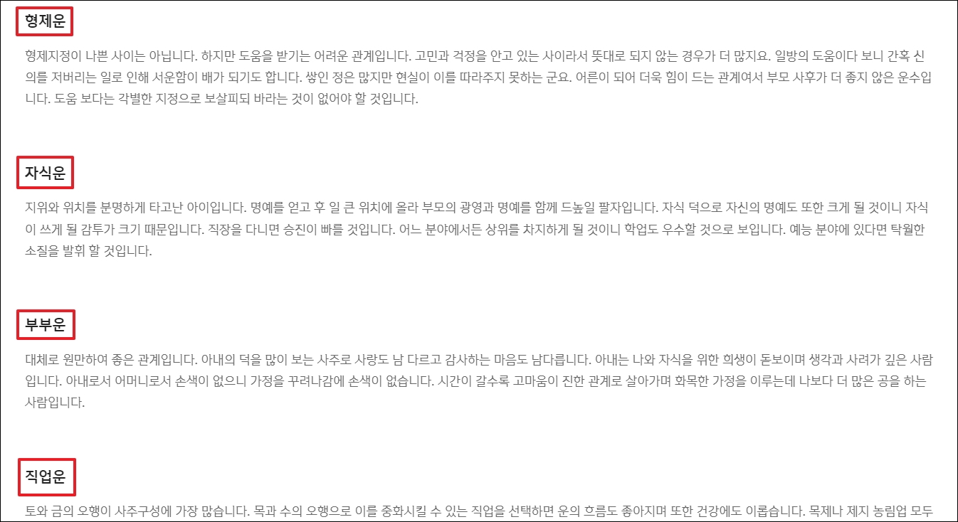▼평생 운세를 통해 형제, 자식, 직업, 부부 등 다양한 요소에 관련하여 나의 사주 풀이 내용을 만나볼 수 있습니다.