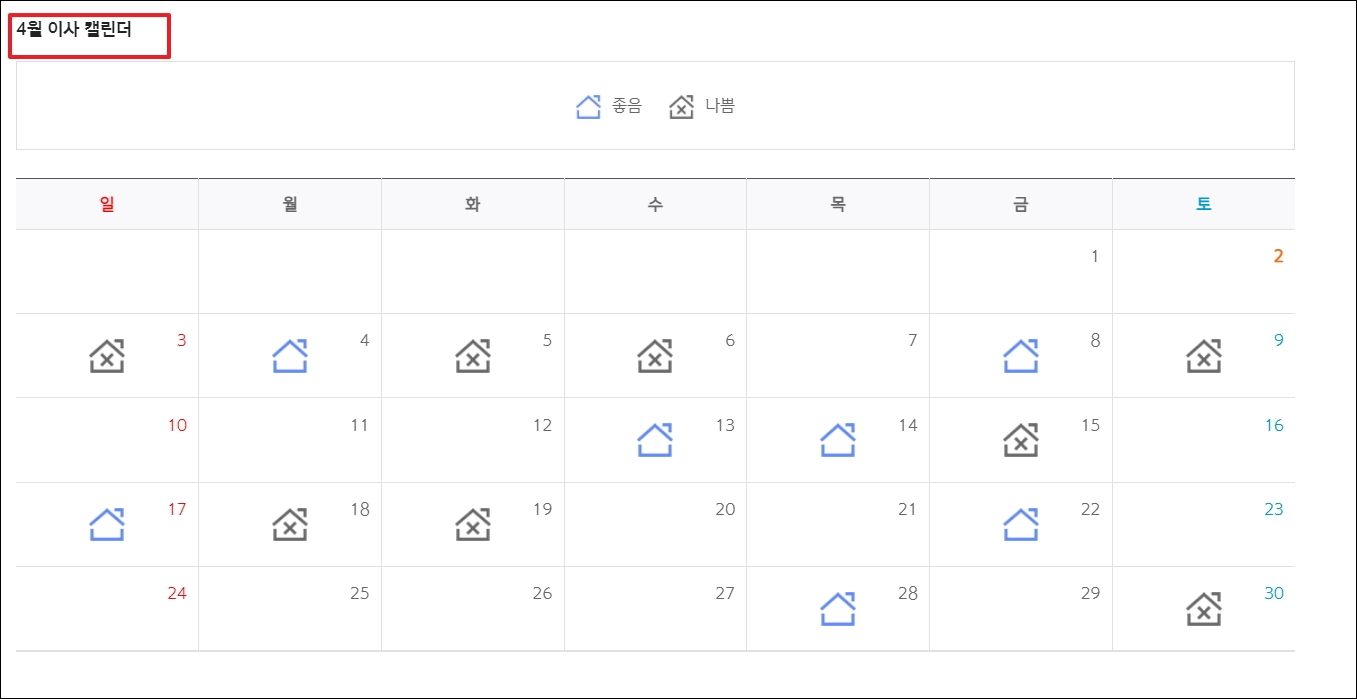 ▼이사를 준비중인 경우에는 이사 캘린더를 확인하면 됩니다. 어떤 날짜에 이사를 가는 것인지 캘린더를 통해 확인할 수 있습니다. 손 없는 날처럼 아무래도 좋은 날짜에 이사하는 것이 좋을 것이라고 생각이 됩니다.