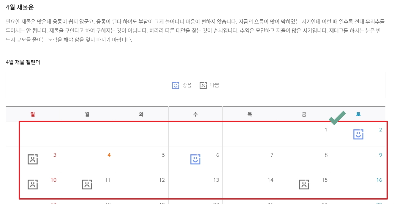 ▼재물이 들어오는 날이나 비즈니스를 하기 좋은 날 그리고 이사하기 좋은 날에 대한 것들에 대한 것도 다루고 있습니다. 캘린더 형식으로 결과를 보여주기 때문에 한눈에 파악하기에 정말 좋습니다.