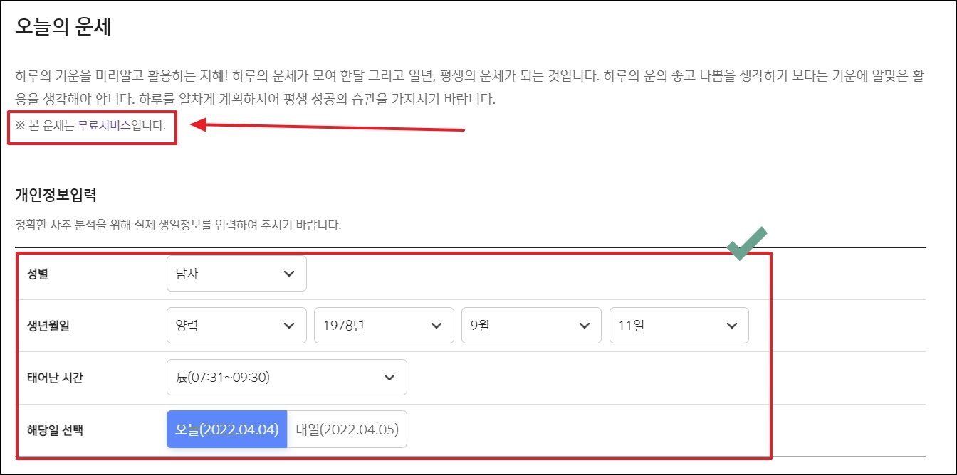 ▼오늘의 운세를 선택하면 이렇게 새로운 페이지가 열립니다. 안내를 보면 무료 임을 명확하게 나타내고 있죠. 간단한 개인 정보 입력은 필수입니다. 이러한 정보를 바탕으로 사주 풀이를 해주기 때문입니다. 오늘은 물론이고, 내일에 좋은 행운의 숫자를 알아보는 것도 가능합니다.