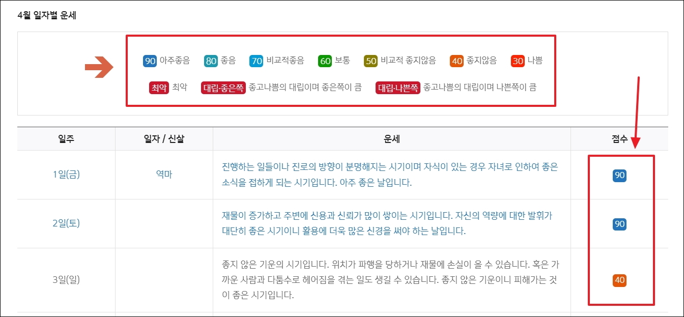 ▼월간 종합운세를 보면 일자별 운세 풀이가 있습니다. 여기에서 매일마다 어떤 운이 들어오는지 자세히 알려줍니다. 여기에 더하여 점수 부분이 있는데, 해당 점수를 통해 오늘이 행운의 날인지 불운의 날인지 쉽게 파악할 수 있습니다.