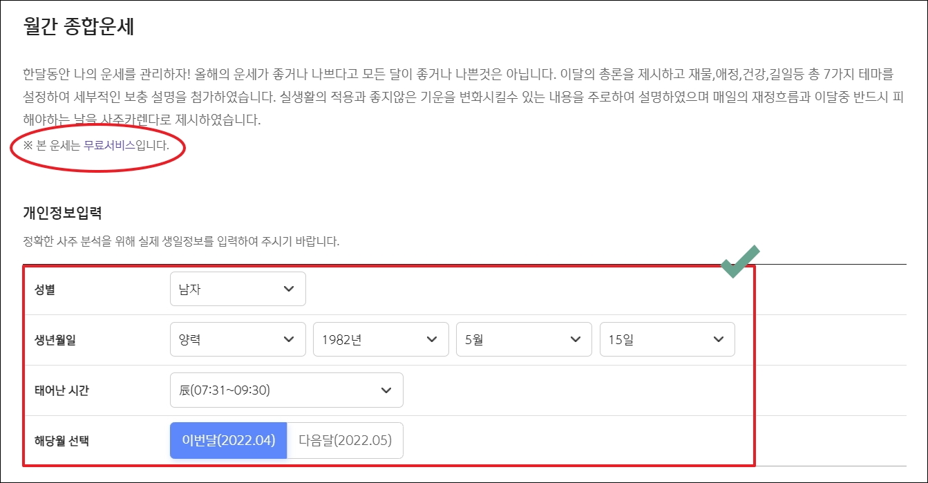 ▼오늘의 운세를 선택하면 이렇게 새로운 페이지가 열립니다. 안내를 보면 무료 임을 명확하게 나타내고 있죠. 간단한 개인 정보 입력은 필수입니다. 이러한 정보를 바탕으로 사주 풀이를 해주기 때문입니다. 오늘은 물론이고, 내일에 좋은 행운의 숫자를 알아보는 것도 가능합니다.