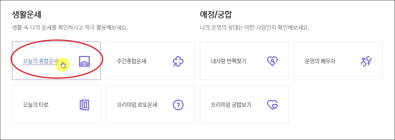 ▼사주 서비스 페이지에 접속했습니다. 여기에서는 여러 가지 운세 서비스가 마련되어 있습니다. 행운의 색깔, 번호, 성씨 등을 알아보려면 [오늘의 종합운세]를 이용하면 됩니다. 참고로 여기에서는 오늘의 타로, 프리미엄 궁합 등 재미있는 것도 많으니 나중에 함께 이용해 보시길 바랍니다.