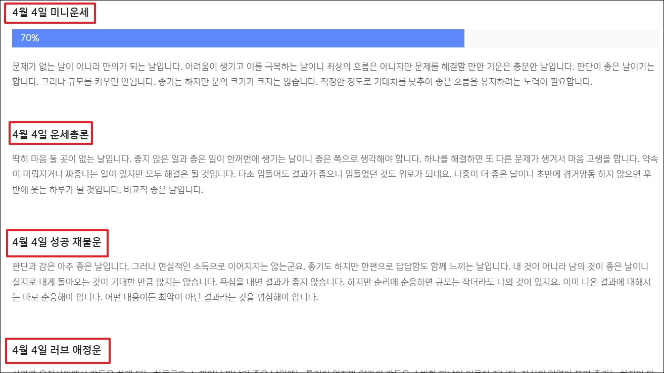 ▼월간 종합운세를 보면 일자별 운세 풀이가 있습니다. 여기에서 매일마다 어떤 운이 들어오는지 자세히 알려줍니다. 여기에 더하여 점수 부분이 있는데, 해당 점수를 통해 오늘이 행운의 날인지 불운의 날인지 쉽게 파악할 수 있습니다.
