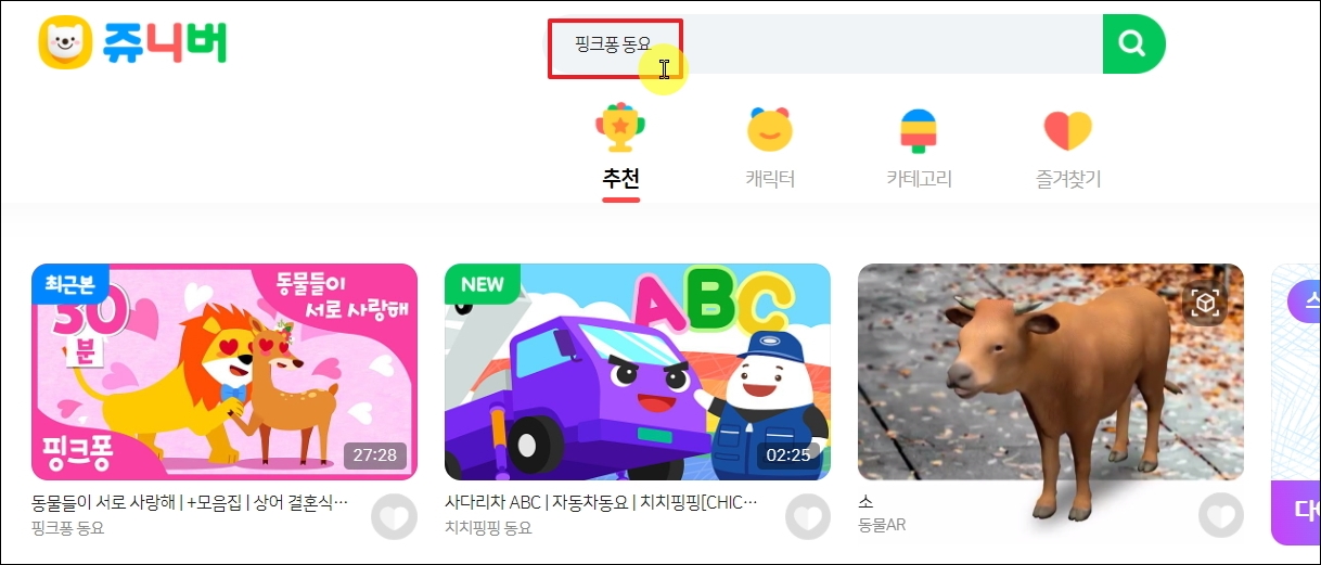 ▼쥬니버 사이트에 접속하면 메인화면에 여러 가지 컨텐츠를 만나볼 수 있습니다. 동물들이 서로 사랑해, 사다리차 ABC 동요가 보입니다. 동물AR 컨텐츠도 있는데, 어린이들이 좋아한만한 신기술로 보닙니다. 동요 연속듣기 위해서 검색창에 "핑크퐁 동요"를 입력 후 검색 버튼을 눌러줍니다.