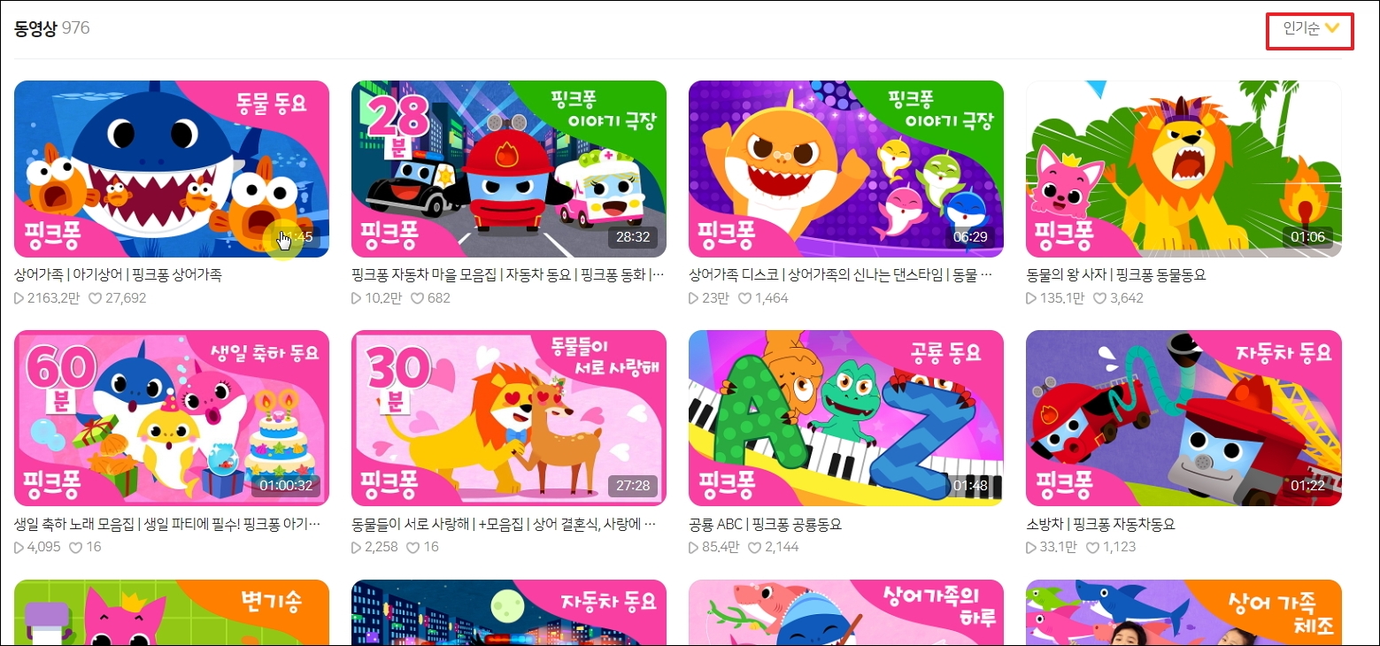▼이렇게 인기순으로 동요 연속듣기 시리즈를 정렬할 수 있습니다. 이왕 아이에게 들려주는 거 인기가 많은 곡을 들려줘야 아이가 더 좋아합니다. 유명한 아기상어 노래도 보입니다.