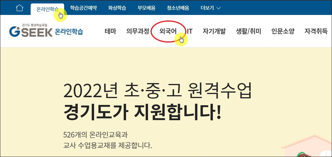 ▼GSEEK 온라인 학습 사이트에 접속했습니다. 메뉴에서 [온라인 학습]을 클릭해 봅니다. 그럼 영어회화와 관련된 외국어 카테고리는 물론이고, 테마, 의무과정, IT, 자기개발, 인문소양, 생활, 취미 등 다양한 교육 카테고리가 있습니다. 공부하고 싶은 분야가 있다면 찾아보시길 바랍니다. 모두 무료 듣기 가능합니다.