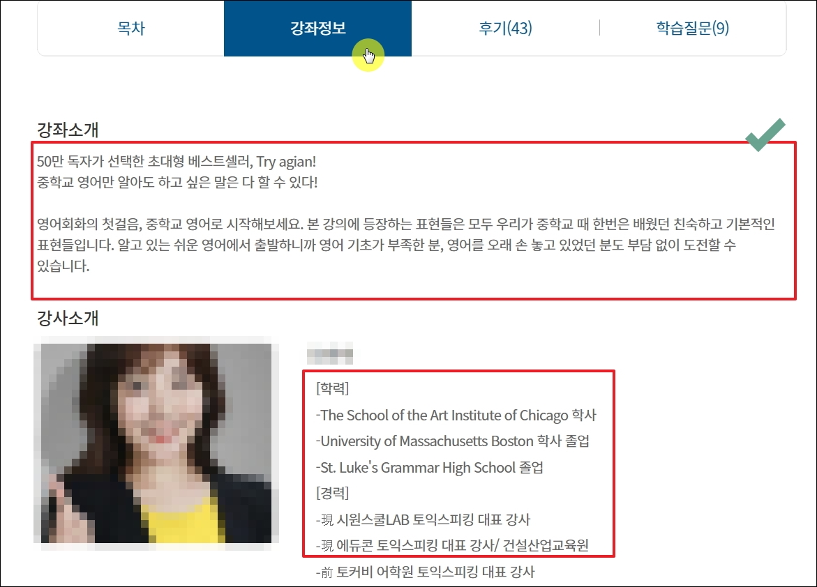 ▼강좌 정보를 통해 어떤 것을 배울 수 있는지 자세히 알 수 있습니다. 강사 소개 부분을 보면 꽤 높은 실력을 가진 분들이 강의를 하는 영어회화 컨텐츠 임을 알 수 있습니다.