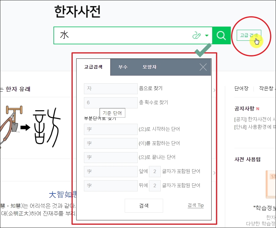 ▼그려서 한자 찾기 방식이 마음에 들지 않는다면 검색창 옆에 있는 [고급 겁색] 버튼을 눌러봅니다. 그럼 음, 총 획수, 부수, 모양자를 이용한 한자 찾기 기능을 이용할 수 있습니다. 어떤 방법을 사용하던 직접 사용해보고 자신에게 유리한 것을 사용하면 됩니다.