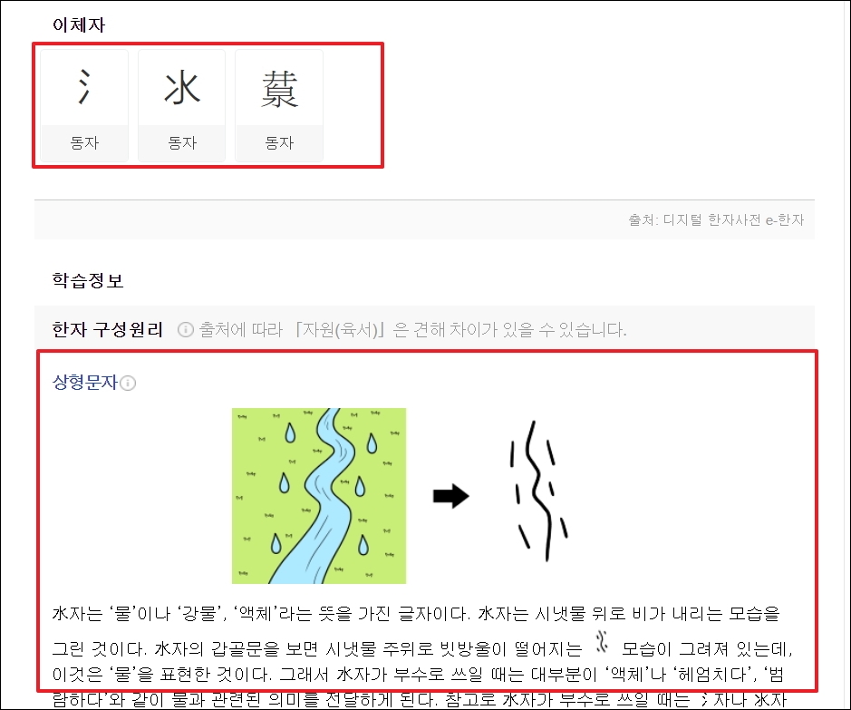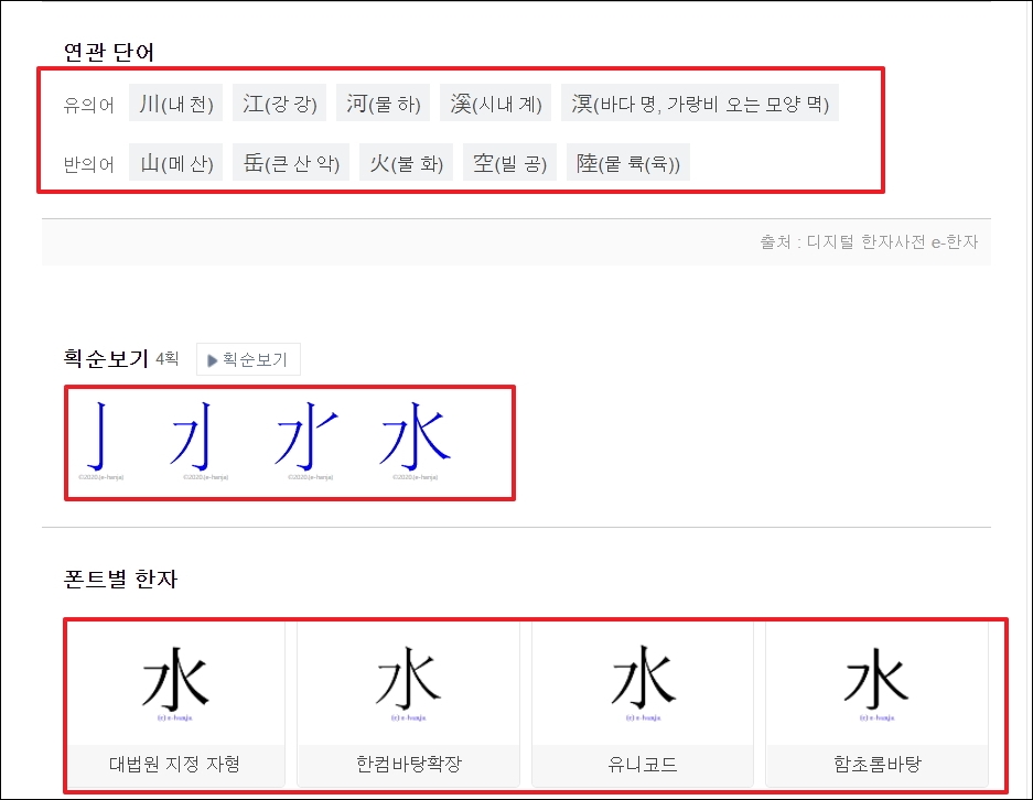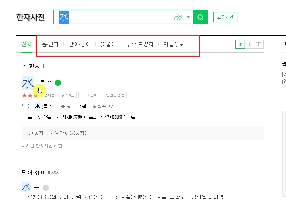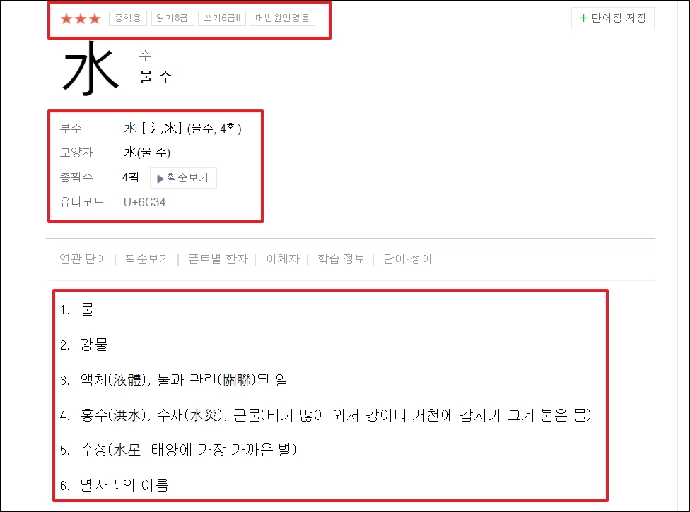 ▼저는 "물 수"라는 한자를 선택했습니다. 해당 문자에 대한 부수, 모양자, 총획수, 유니코드는 물론이고, 꽤 많은 뜻을 알아볼 수 있습니다. 대법원 인명용 한자에 속하는지 여부도 여기서 알아볼 수 있습니다.