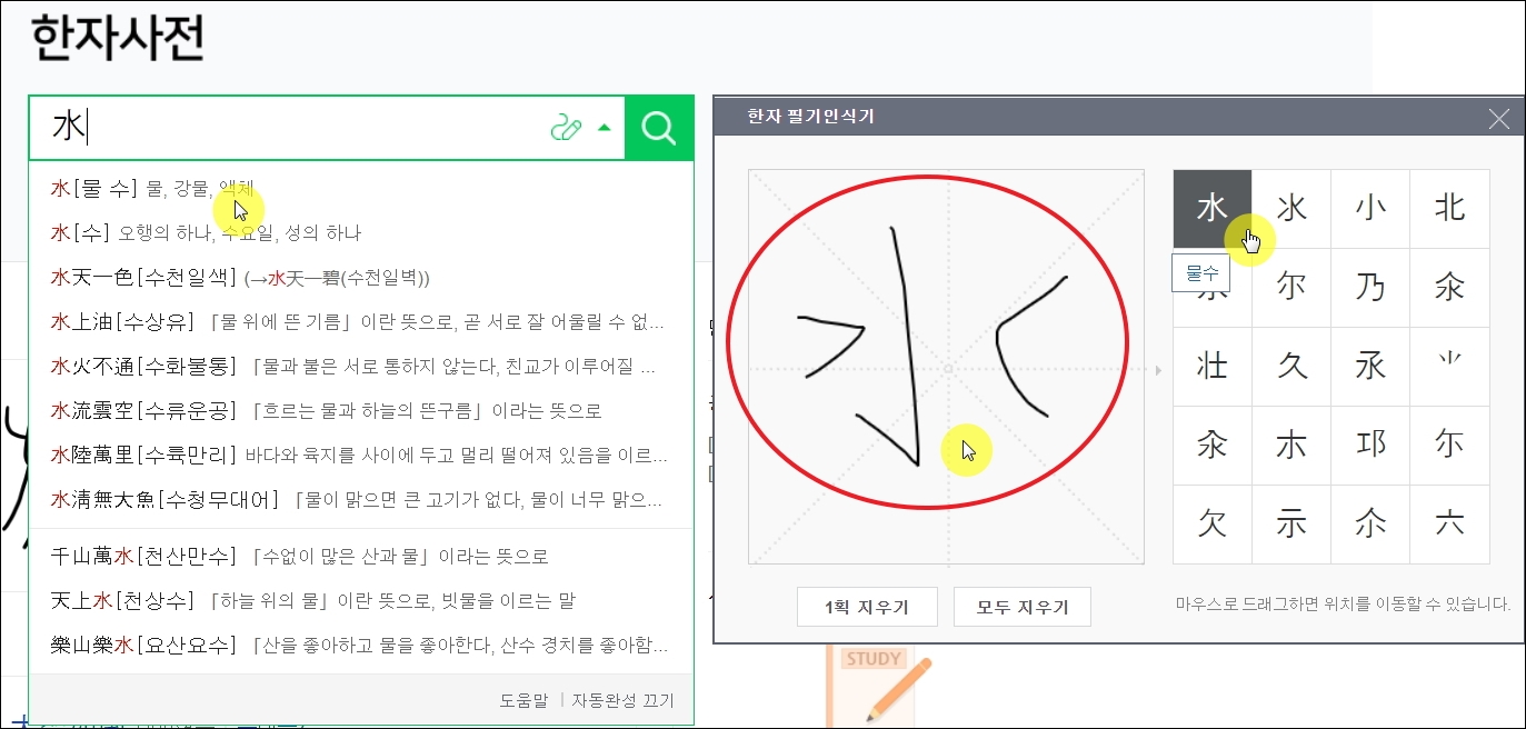 ▼[필기하는 모양]의 아이콘을 누르면 한자 필기인식기가 나타납니다. 여기에 마우스로 모르는 한자를 그려봅니다. 그럼 해당 그림과 가장 유사한 한자 20가지가 나타납니다. 여기에서 본인이 그리려고 했던 문자를 마우스로 클릭하면 됩니다. 그럼 한자사전 검색창에 해당 문자가 입력됩니다. 이 상태에서 엔터키 또는 검색 버튼을 누르면 됩니다.