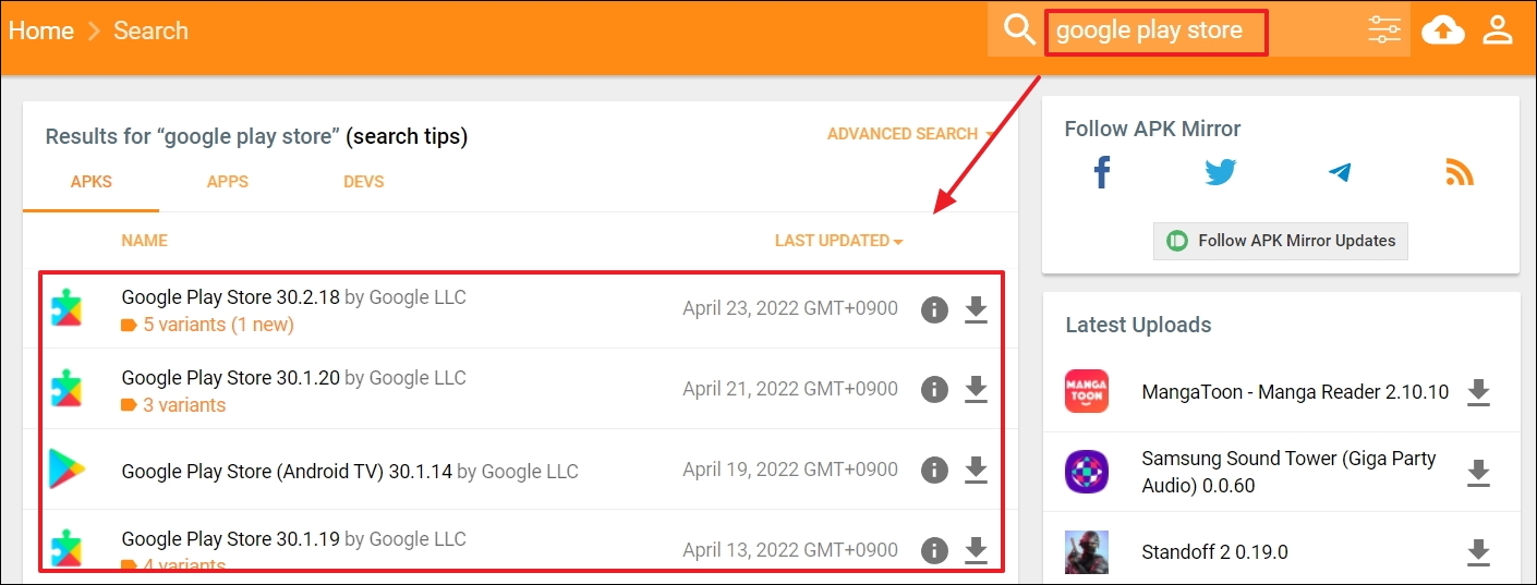 ▼play스토어 앱을 찾기 위해서는 우측에 있는 검색창에 "google play store"라고 입력한 후 엔터키는 누르는 것이 빠릅니다. 검색 결과가 나왔습니다. 최신 버전은 물론이고, 과거에 출시한 버전들이 모두 나옵니다. 혹시 리스트에 2014년 버전만 많이 나온다면 [Last Updated]를 클릭하면 됩니다. 그럼 최신 버전 순서로 play스토어 apk 파일 리스트 정렬이 됩니다.