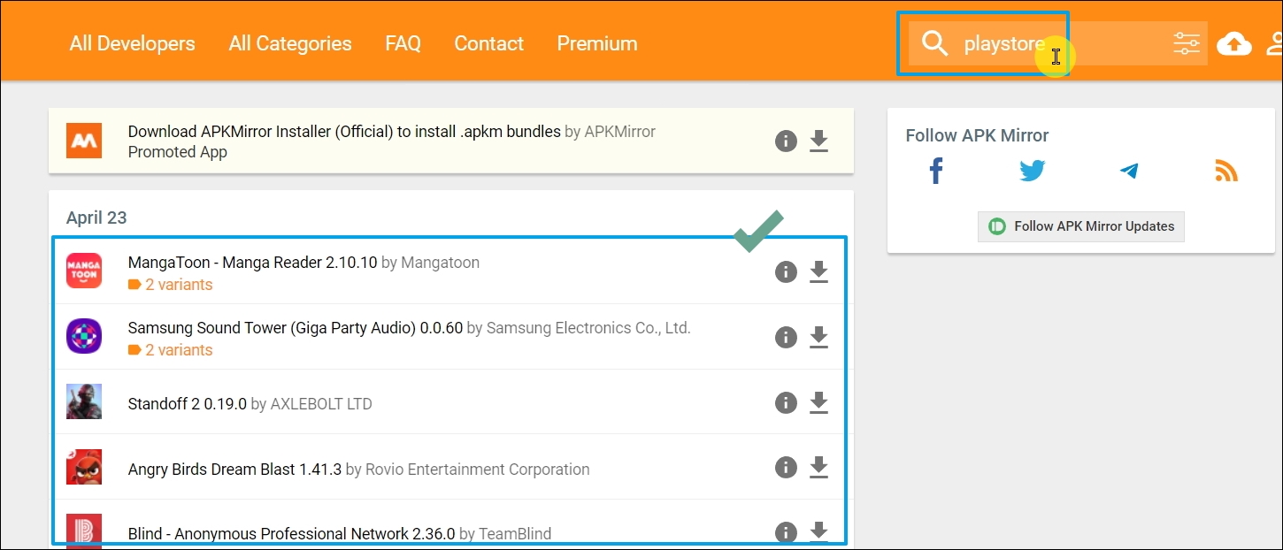 ▼play스토어 무료 다운로드를 할 수 있는 사이트로는 apkmirror가 있습니다. 이곳의 경우 play스토어 외에도 다양한 앱을 apk 파일로 제공하고 있는 곳이죠. 사이트 안내 문구에 나와 있듯이 APK 파일을 무료 제공합니다. (Free APK Downloads)