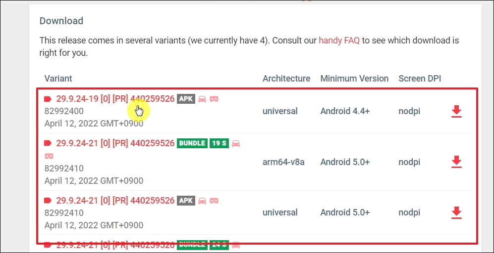 ▼다운 받고 싶은 버전을 선택하면 이렇게 다운로드 받을 수 목록이 나타납니다. 아키텍쳐, 최소 안드로이드 사양, DPI를 참고하여 본인이 사용하는 기기에 맞는 것을 선택하면 됩니다.
