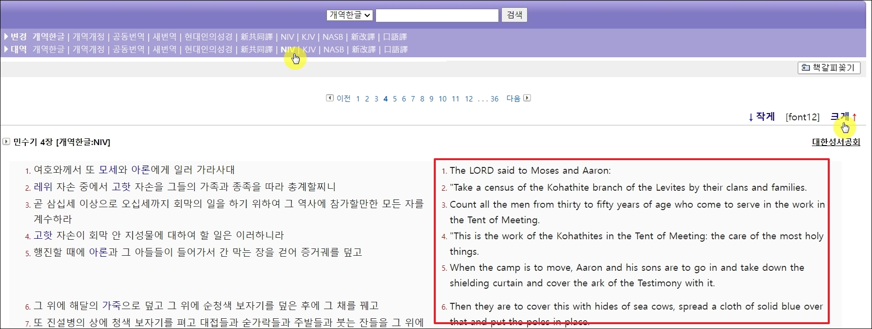 ▼화면 왼쪽에는 한국어로 된 성경을 배치하고, 오른쪽에는 영문으로 된 성경을 배치하는 것이 가능합니다. 화면 상단에 있는 메뉴에서 [대역] 부분에 있는 NIV, NASB, KJV 중 하나를 선택하면 됩니다. 그리고 폰트 크기를 키우는 것도 가능합니다. 글자가 작아서 내용이 잘 보이지 않을 때 사이트 우측 상단에 있는 [크게] 버튼을 클릭하면 됩니다. 클릭한 횟수만큼 글자 크기가 늘어납니다.