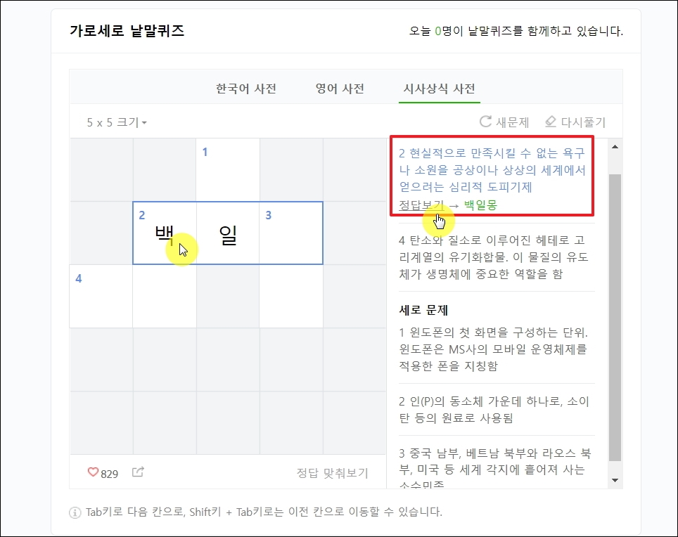 ▼시사상식을 물어보는 문제도 있으니 낱말맞추기 게임을 진행해 보길 바랍니다. 문제를 풀다가 특정 문제에 대한 답만 확인하고 싶을 수 있습니다. 이런 경우에는 문제 부분에 마우스 클릭을 하면 [정답 보기] 버튼이 나타납니다. 해당 버튼을 클릭하면 정답인 낱말을 확인할 수 있습니다.