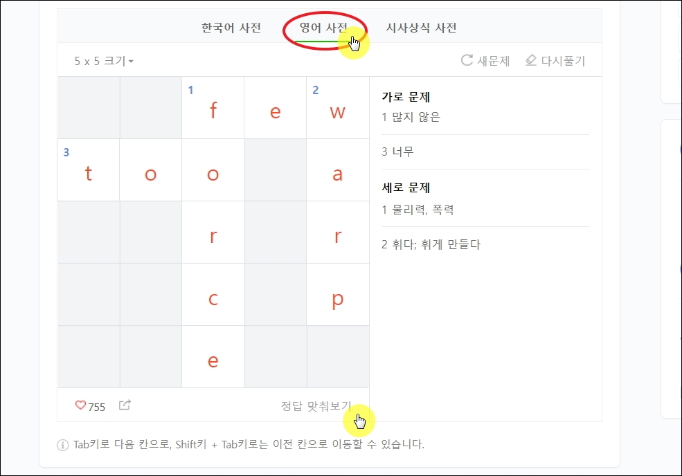 ▼네이버 가로세로 낱말맞추기 게임의 경우 3가지 크기와 3가지 사전을 사용합니다. 처음에는 5x5 사이즈를 이용하다가 실력이 늘면 10x10 사이즈로 변경하면 됩니다. 빈 칸을 마우스로 선택한 후 답을 입력하면 됩니다. 키보드로 커서 이동을 하고 싶다면 Tab키와 Shift + Tab키를 사용하면 됩니다. 그럼 다음 칸 또는 이전 칸으로 커서가 이동합니다.
