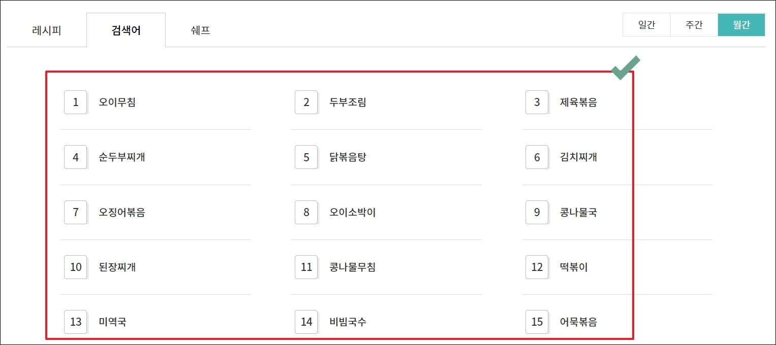 ▼제가 자주 이용하는 사이트를 이용하면 많은 사람들이 최근 선호하는 반찬 종류를 확인해 볼 수 있습니다. 일간, 주간, 월간 순위를 이렇게 3가지 방식으로 맛있는 반찬 확인이 가능하죠. 최근 1위는 오이무침입니다. 그 다음으로는 두부조림, 제육볶음, 순두부찌개, 닭볶음탕, 김치찌개, 오징어볶음, 오이소박이, 콩나물국, 된장찌개가 2위부터 10위를 차지하고 있죠.