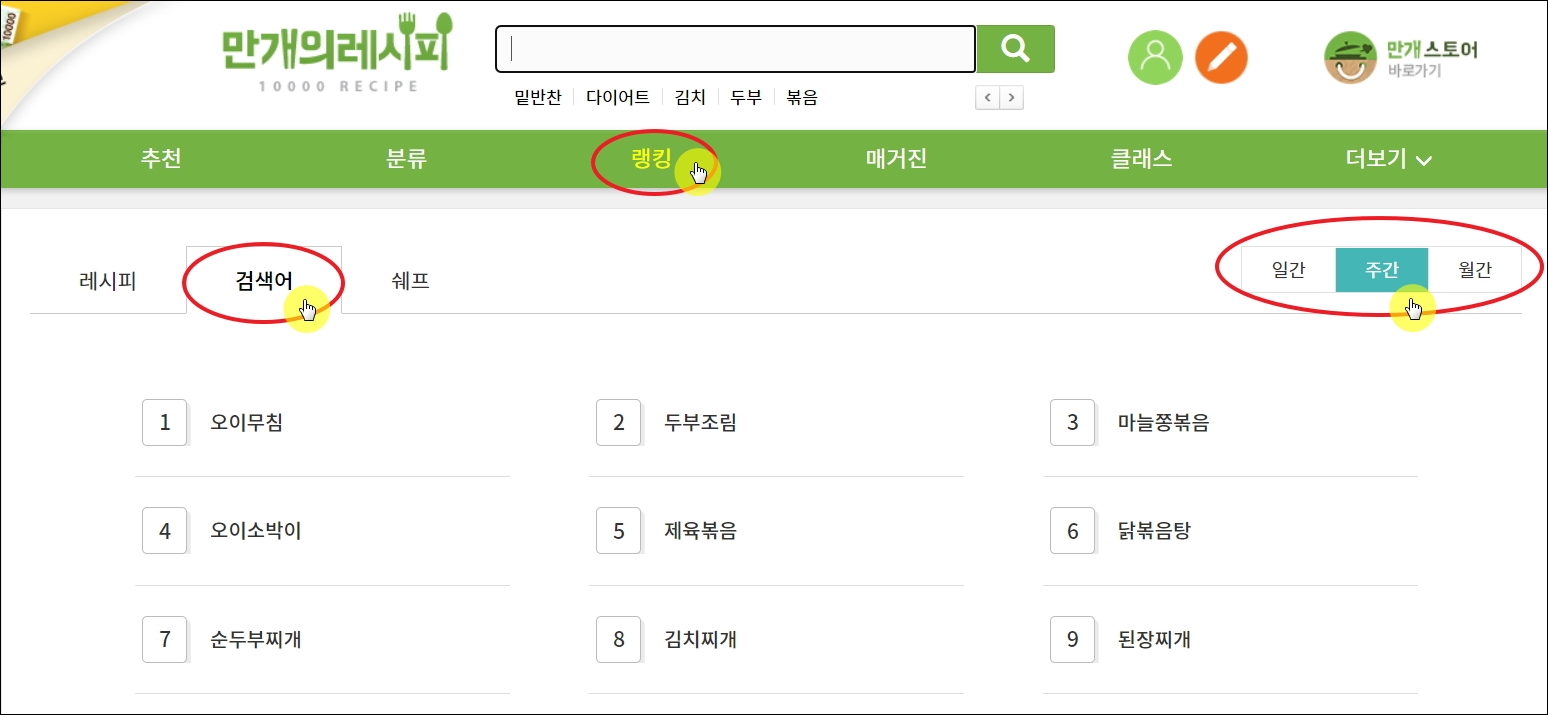 ▼만개의 레시피 사이트에 접속했습니다. 메뉴를 보면 여러 가지 요리 관련 서비스가 나타납니다. 제 경우에는 반찬 종류를 확인하고 싶을 때 [랭킹] 메뉴를 사용합니다. [랭킹] 메뉴에서 검색어 탭으로 들어가면 일간, 주간, 월간 반찬 순위를 선택할 수 있습니다.