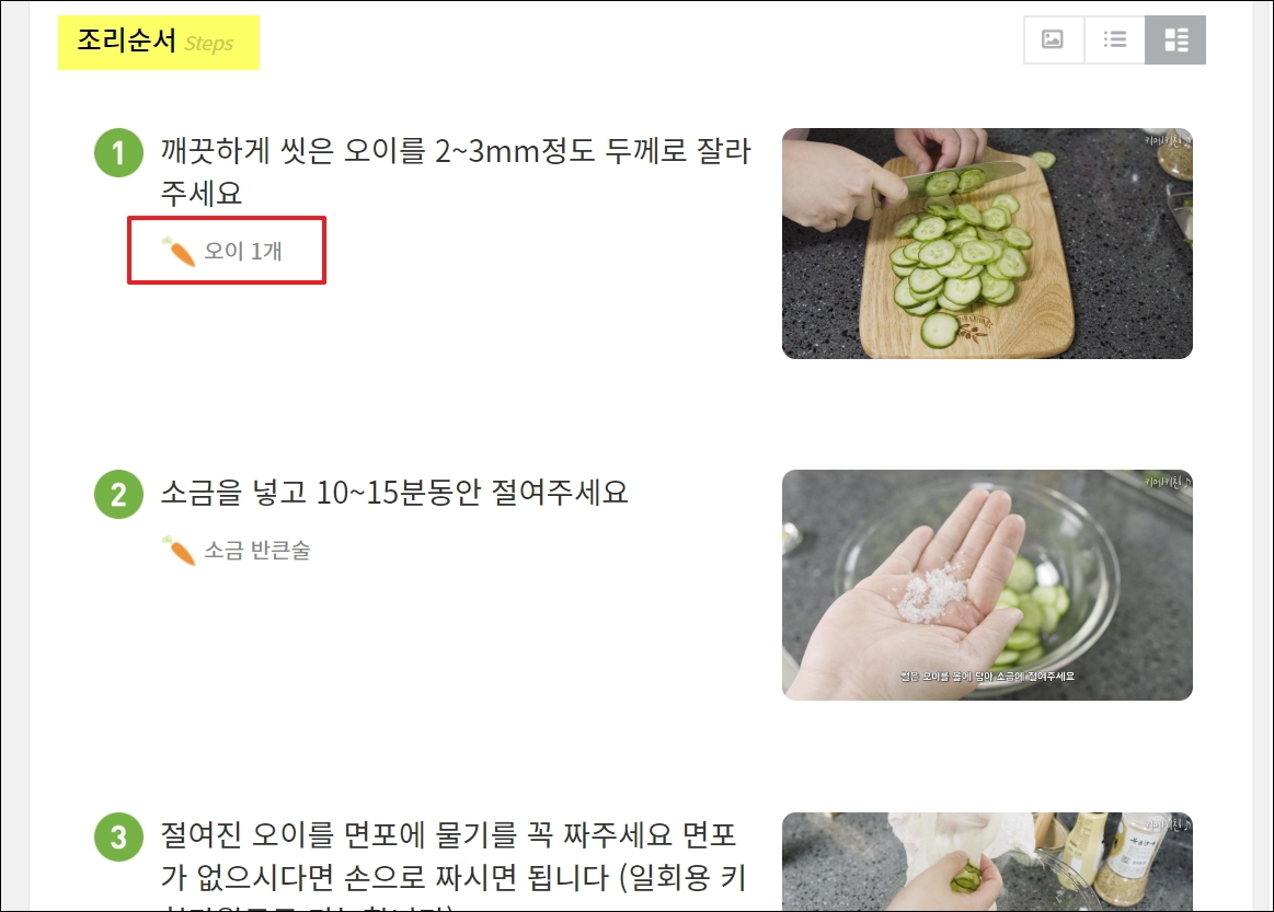 ▼조리 순서를 보면 알 수 있듯이 꽤 상세하게 알려줍니다. 각 단계마다 요리하는 사진과 사용하는 재료 그리고 설명이 자세히 나와 있습니다. 재료 손질에 대한 노하우 영상도 있기 때문에 요리 초보자도 많은 것을 배우며 손쉽게 따라할 수 있습니다.