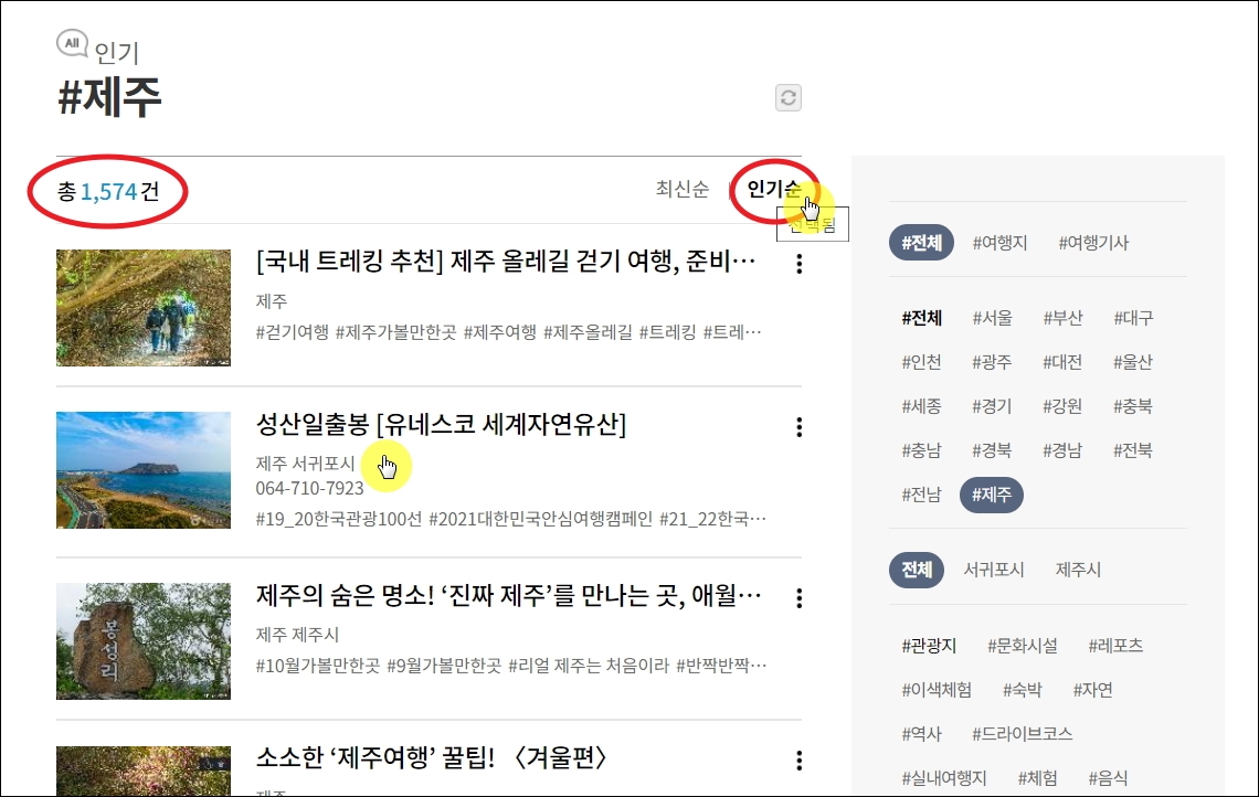 ▼이곳에서 추천하는 인기 제주도 여행지의 갯수만 1,574건이나 됩니다. 모두 살펴볼 수 없을 정도로 방대한 양이죠. 우측에 있는 태그 기능을 통해 본인 취향에 맞게 조건 설정을 하면 좀 더 수월하게 마음에 드는 관광지를 찾을 수 있습니다. 저는 개인적으로 좋아하는 제주도 여행지인 성산일출봉을 선택해 보겠습니다.