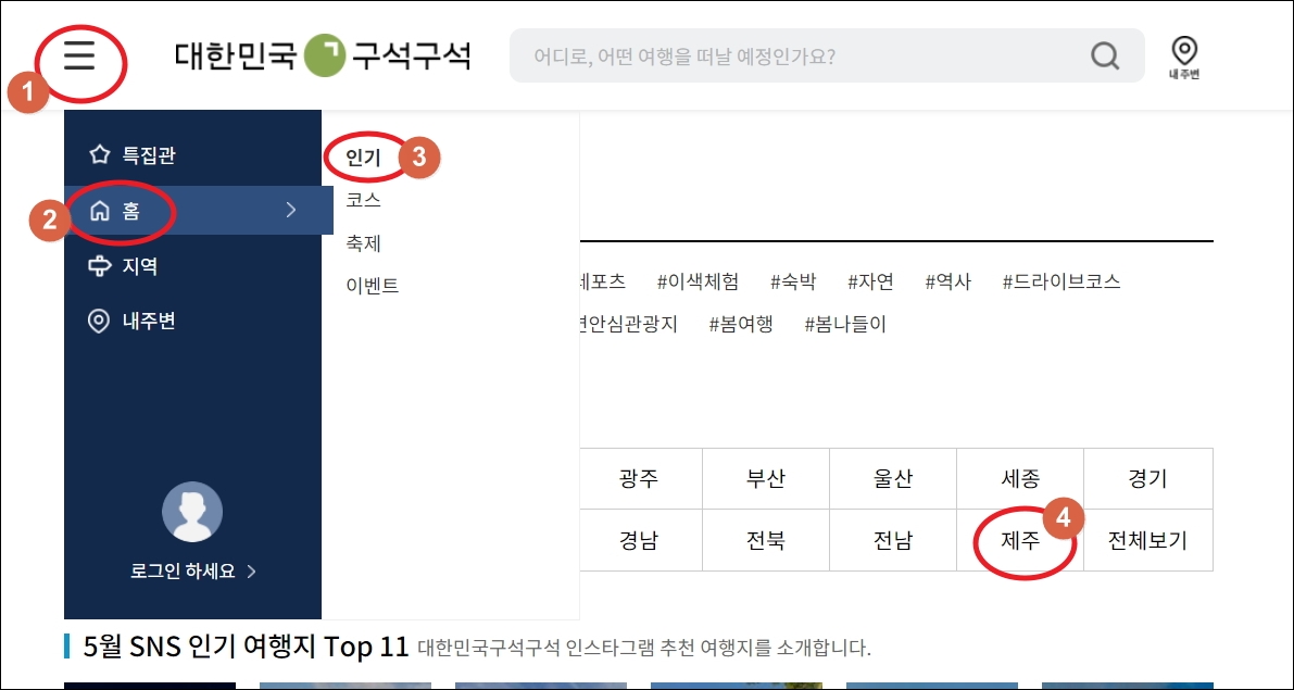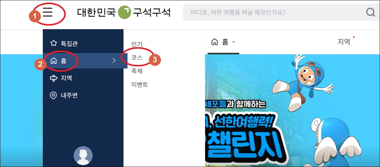 ▼여행코스 추천을 받기 위해서는 사이트 메인화면 좌측 상단에 있는 메뉴를 선택해야 합니다. [홈]과 [코스] 메뉴를 차례대로 클릭합니다.
