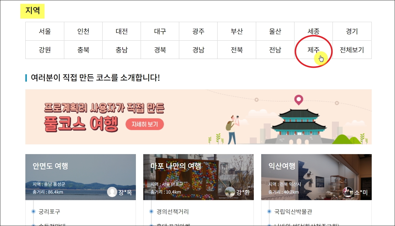 ▼여행코스를 추천 받고 싶은 지역을 선택할 차례입니다. 이곳에서는 제주도 외에 서울, 인천, 대전, 대구, 경남, 전북 등 여러 지역의 2박3일 여행코스를 알려줍니다. 이번 시간에는 제주도 중심으로 알아보겠습니다.