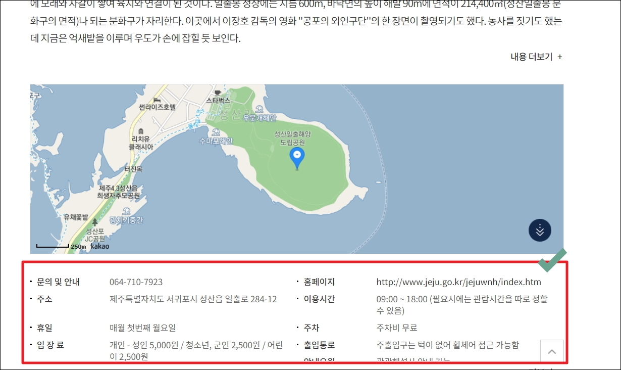 ▼지도 화면을 통해 성산일출봉의 정확한 위치를 알 수 있습니다. 더불어 문의 및 안내를 할 수 있는 연락처, 관련 홈페이지, 이용시간, 주차 정보, 휴일 일정, 입장료 등 여행 전에 알고 있으면 좋은 정보를 양껏 제공하고 있습니다.
