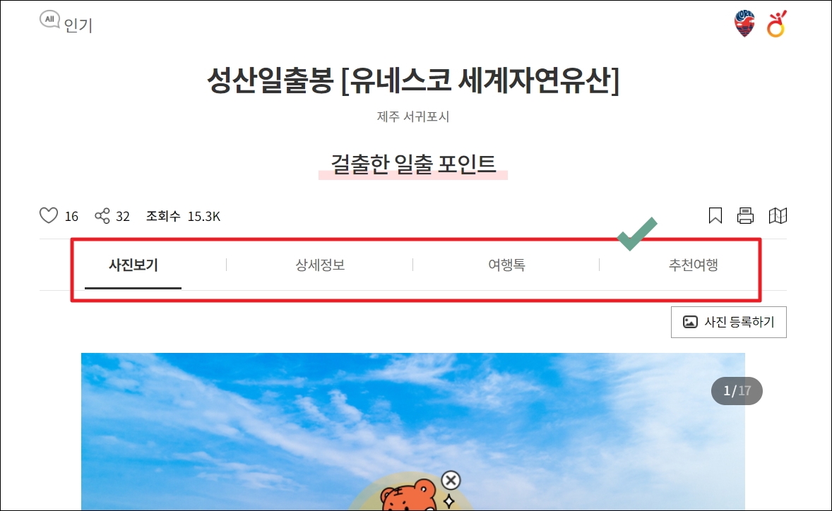 ▼관광지로 유명한 성산일출봉에 대한 페이지가 열렸습니다. 여러 개의 사진, 상세 정보, 여행 톡, 추천 여행 정보를 얻을 수 있습니다.