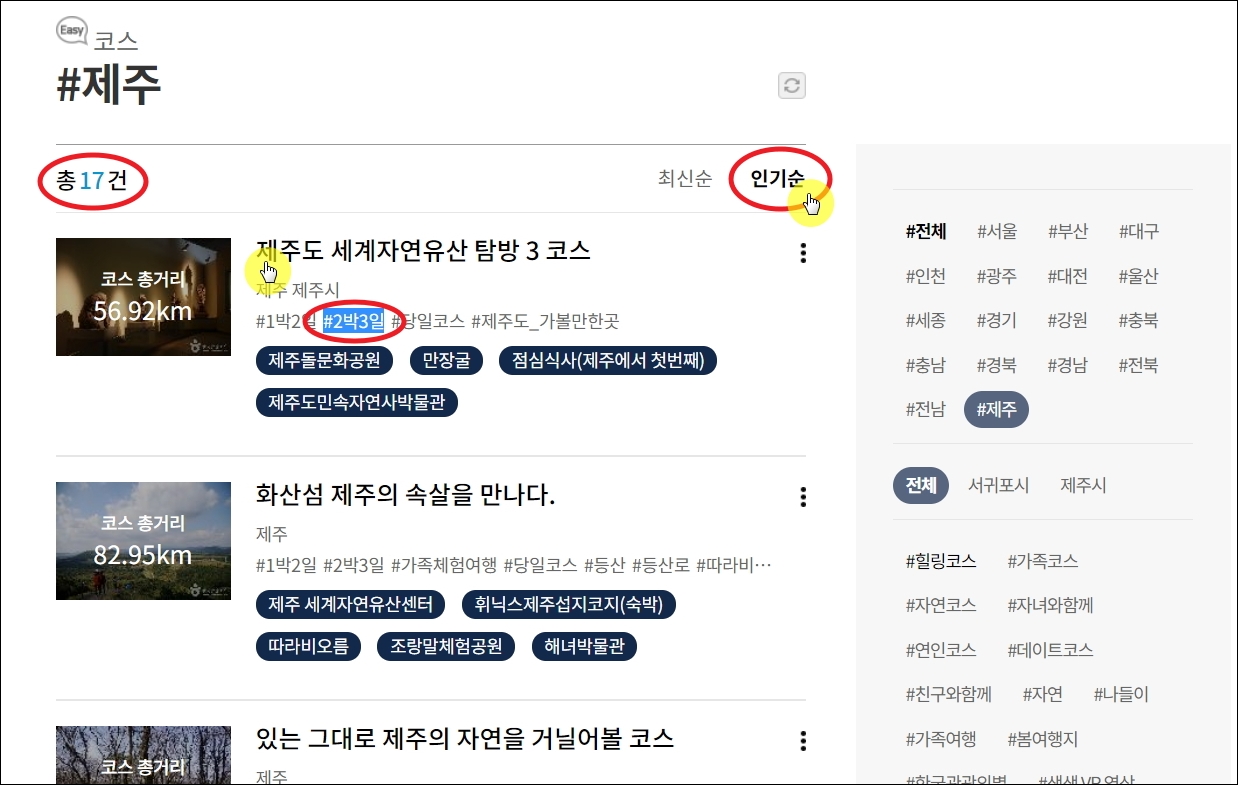 ▼제주도를 선택하니 2박3일로 여행하기 좋은 코스가 17건이나 나왔습니다. 최신순 또는 인기순으로 정렬하여 마음에 드는 여행코스를 찾아보시길 바랍니다. 저는 2박3일 여행하기 좋은 [제주도 세계자연유산탐방 3코스]를 선택해 보겠습니다.