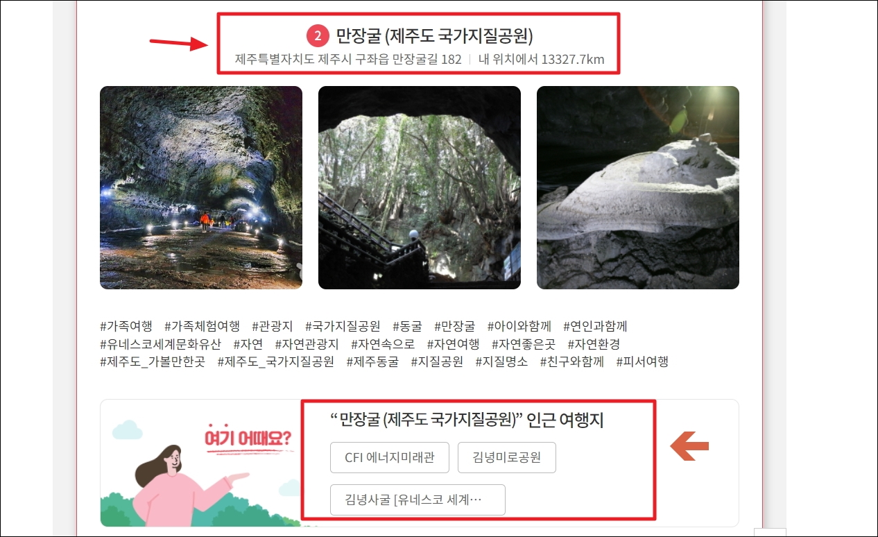 ▼관광지 선택을 해보면 다음과 같이 상세 주소와 여러 사진이 나타납니다. 여기에 더하여 여행코스를 일부 수정하고 싶을 때 참고하기 좋은 "인근 여행지" 정보도 제공하고 있습니다. 만장굴 가까운 곳에 있는 관광지 중 추천하는 곳은 감녕사굴이나 감녕미로공원, CFI 에너지미래관이 있다고 합니다.