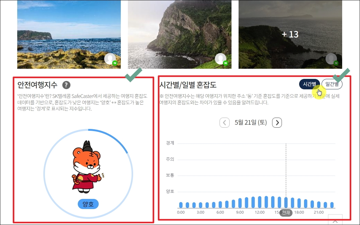 ▼혼자 여행을 할 때 참고하기 좋은 안전여행지수도 알려줍니다. 저처럼 사람이 많은 것을 싫어하는 분들은 시간별 및 일별 혼잡도 그래프 확인을 추천 드립니다.