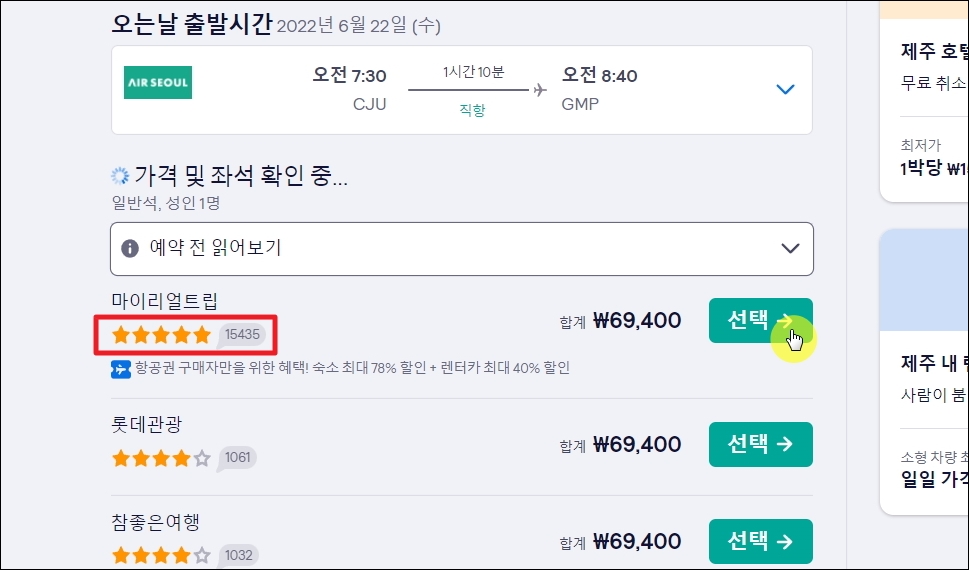 ▼업체 선택을 하자마자 국내선 항공권을 예약할 수 있는 사이트로 이동하게 되었습니다. 여기에서 출발지, 도착지, 탑승 날짜와 시각, 요금 정보 등을 꼼꼼히 확인한 후 [예약하기] 버튼을 누릅니다. 이후부터는 사이트에서 안내하는 것에 따라 정보 입력 및 비용 결제를 진행하면 됩니다.