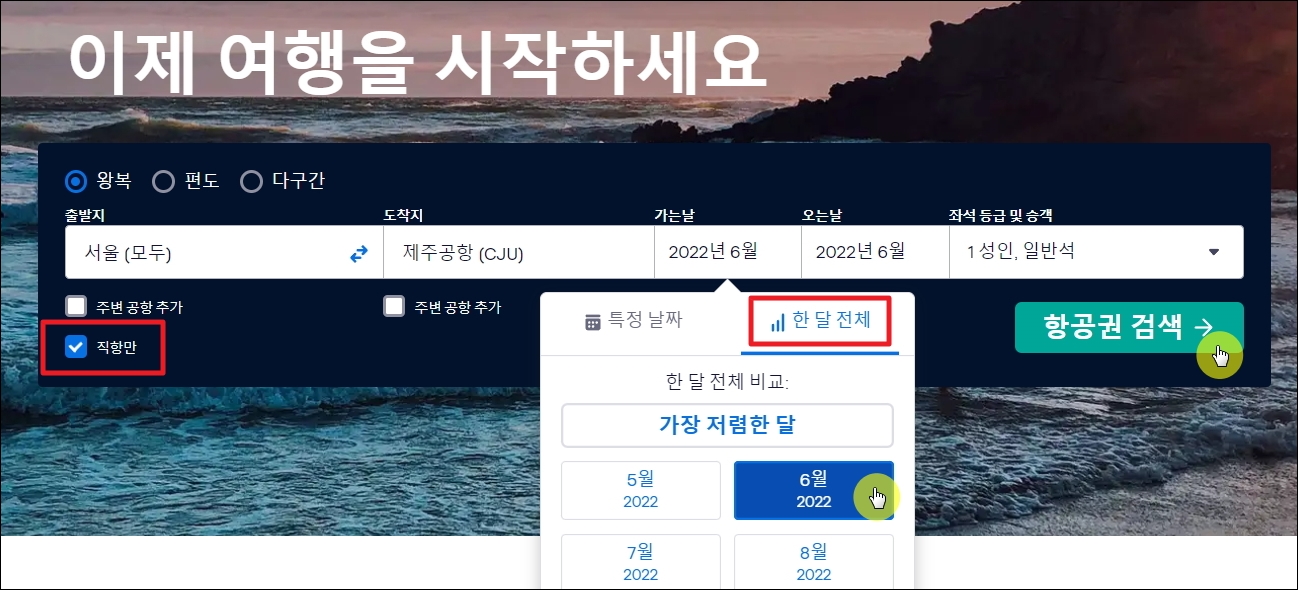 ▼스카이스캐너 사이트를 이용하여 국내선 항공권 예약을 진행해 보도록 하겠습니다. 사이트에 접속하면 가장 먼저 해야 할 일은 이용할 항공권에 대한 정보를 입력하는 것입니다. 출발지, 도착지, 이용 날짜, 좌석 등급 등의 정보를 정확하게 입력합니다. 여기서 최저가 티켓을 찾는 팁을 하나 드리겠습니다. 날짜를 입력하는 부분에서 [한 달 전체] 탭을 눌러 국내선을 이용할 날짜를 한 달 단위로 지정하는 것입니다.