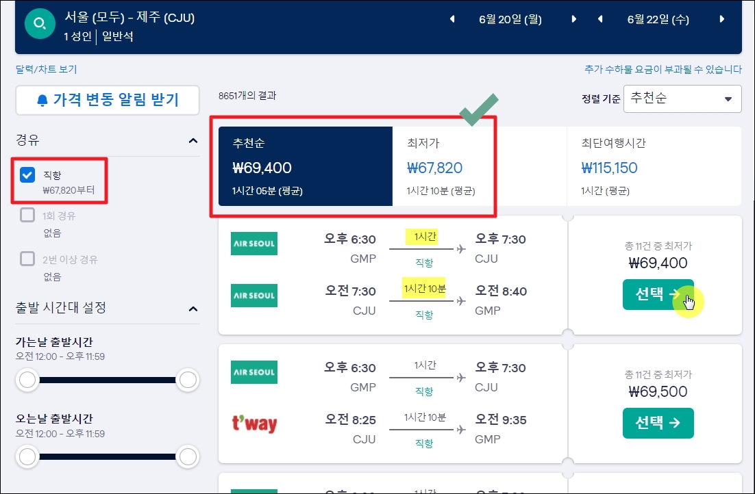 ▼여행지, 여객기 탑승 날짜를 정했으면 마지막으로 항공편을 정할 차례입니다. 제가 선택한 날짜에 운행되는 항공편의 수가 8,651개나 됩니다. 여기에서 가장 저렴하거나 스카이스캐너에서 추천하는 것 위주로 살펴보면 됩니다. 국내선은 대부분 가까운 거리를 운행하기 때문에 [직항] 선택은 필수 입니다. 여러 조건을 살펴보고, 마음에 드는 국내선 항공권을 찾았다면 바로 예약 진행이 가능합니다. 결과 리스트에서 티켓 예매를 진행하고자 하는 항공편을 찾아 [선택] 버튼을 누르면 됩니다.