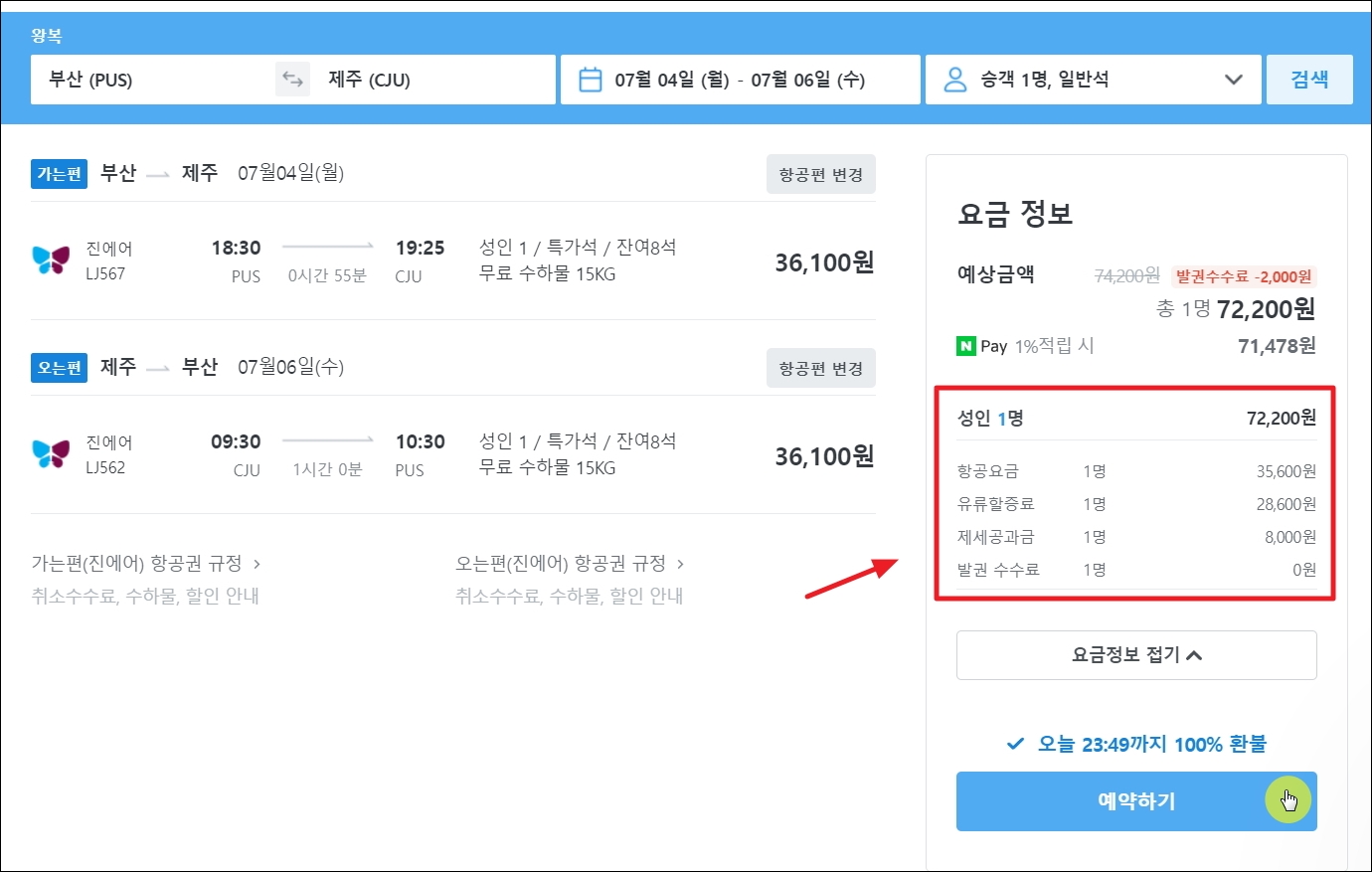 ▼업체 선택을 마치면 다음과 같이 부산에서 제주도 가는 항공권에 대한 예약을 진행할 수 있는 사이트에 접속하게 됩니다. 여기에서 출발지가 부산이 맞는지, 도착지가 제주도가 맞는지 그리고 비행기 이용 날짜를 꼼꼼하게 확인합니다. 우리가 찾은 요금에는 유류할증료, 제세공과금, 발권수수료가 포함되어 있습니다. 중요한 내용을 확인한 이후에는 [예약하기] 버튼을 눌러 안내에 따라 비행기 티켓 예매를 진행하면 됩니다.