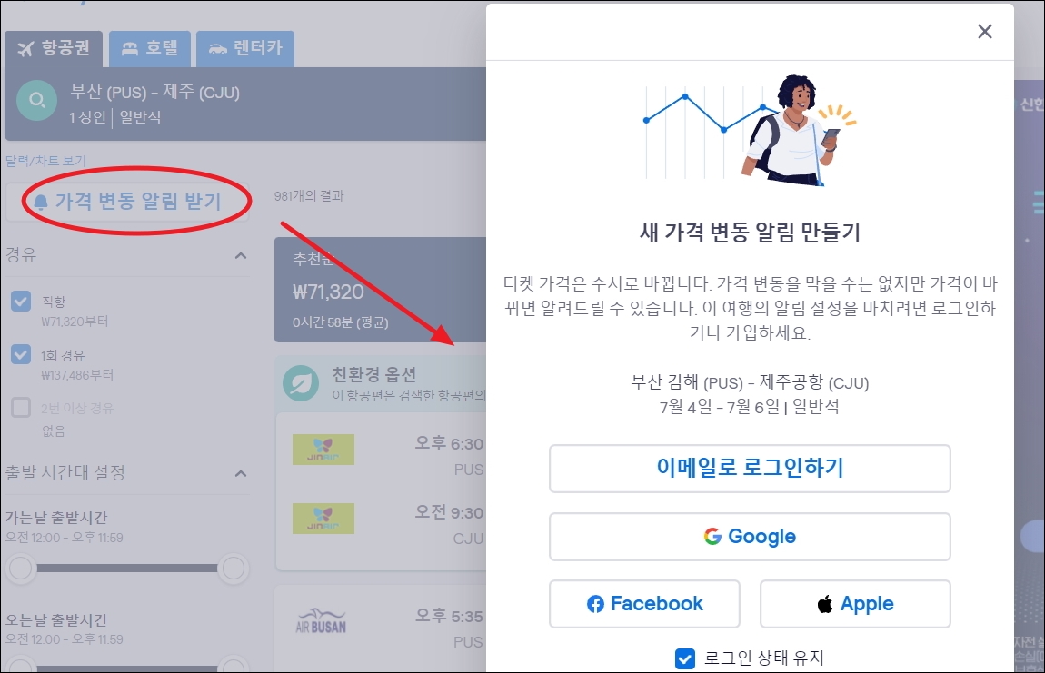 ▼제가 알려드린 대로 알아보았음에도 불구하고 마음에 드는 부산 제주도 항공권을 찾지 못했을 수도 있습니다. 이런 경우에는 [가격 변동 알림 받기] 기능을 이용해 보시길 바랍니다. 부산에서 제주도로 가는 비행기 티켓의 가격이 낮아졌을 때 알림을 받을 수 있습니다. 알림을 받으면 그때 부산 제주도 항공 티켓에 대한 예매를 진행하면 됩니다.