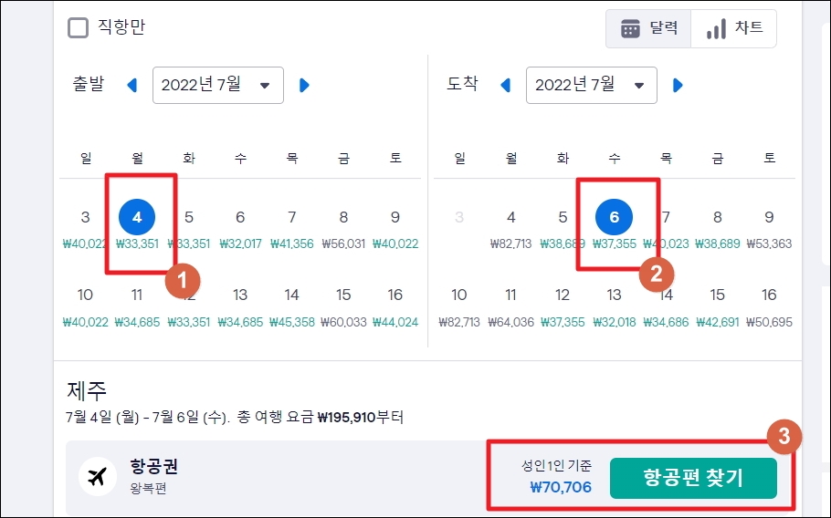 ▼다음 이미지를 보면 달력처럼 되어 있습니다. 날짜별 최저가 비행기 티켓의 가격을 알아보기 위함입니다. 아무래도 부산에서 제주도 가는 항공권을 저렴하게 구할 수 있는 날짜를 선택하는 것이 저렴한 티켓을 구하기에 유리합니다. 날짜를 선택한 후 [항공편 찾기]를 클릭합니다.