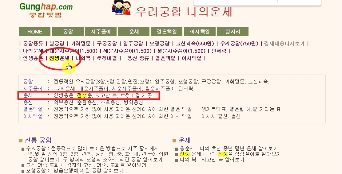 ▼우리 궁합과 나의 운세를 볼 수 있는 궁합닷컴 사이트에 접속했습니다. 메뉴를 보면 알 수 있듯이 무료로 볼 수 있는 무료 운세 서비스가 꽤 많습니다. 인생총운, 나의 복, 토정비결, 결혼택일, 이사택일 등 다양하죠. 이번 시간에는 [전생 운세]를 선택하여 이용해 보도록 하겠습니다.