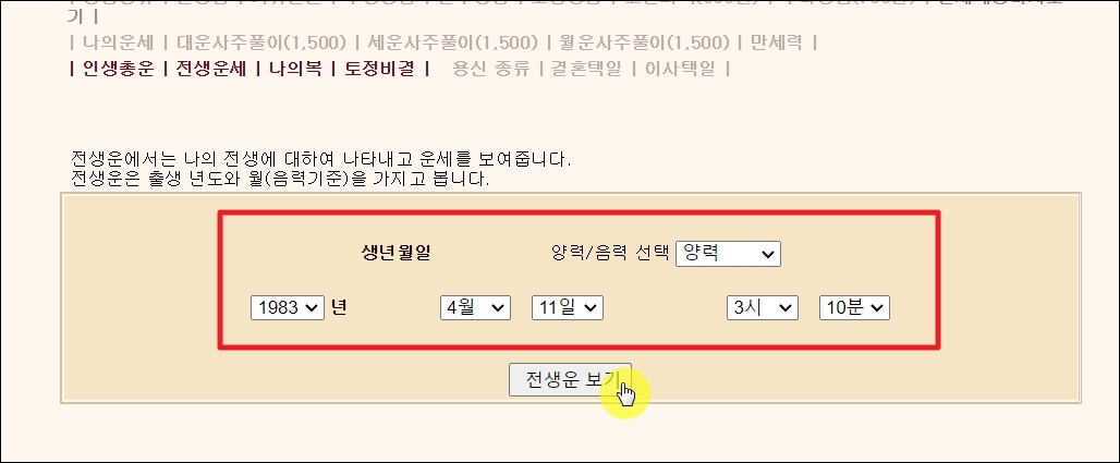 ▼나의 전생운을 알아보기 위해서는 몇 가지 정보를 입력해야 합니다. 생년월일, 양력 및 음력 여부, 태어난 시각을 정확하게 입력해 주세요. 모두 입력했다면 [전생운 보기] 버튼을 클릭합니다.