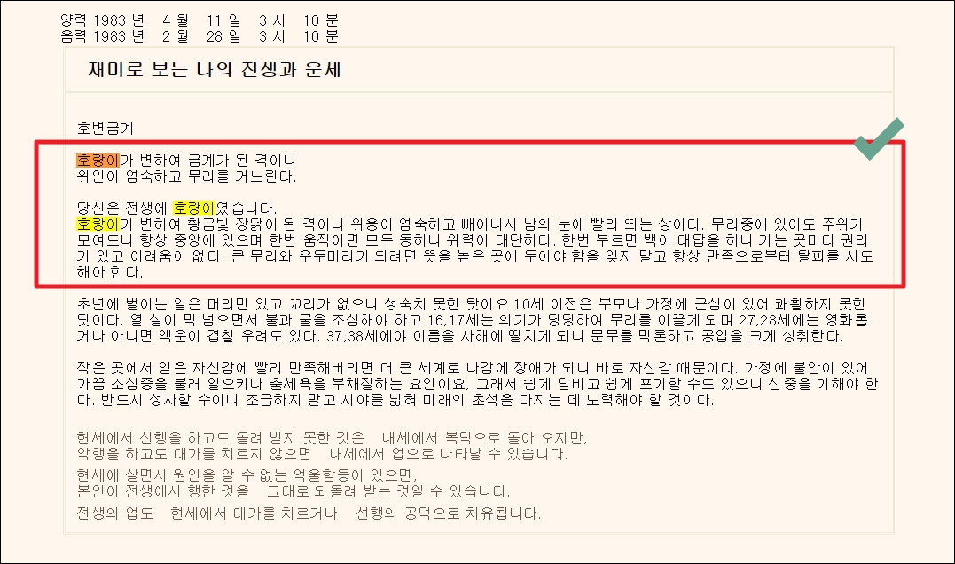 ▼전생운 테스트 결과가 나왔습니다. 제 경우에는 전생에 호랑이였다고 합니다. 호랑이가 변하여 황금빛 장닭이 된 격이라고 하는데, 이런 경우에는 위용이 엄숙하고 빼어나서 남의 눈에 잘 띄는 상을 가졌다고 합니다. 초년과 중년에는 어떤 사주를 가졌고, 더 나은 삶을 살기 위해 어떤 마음가짐을 가져야 하는지 자세히 알려줍니다.