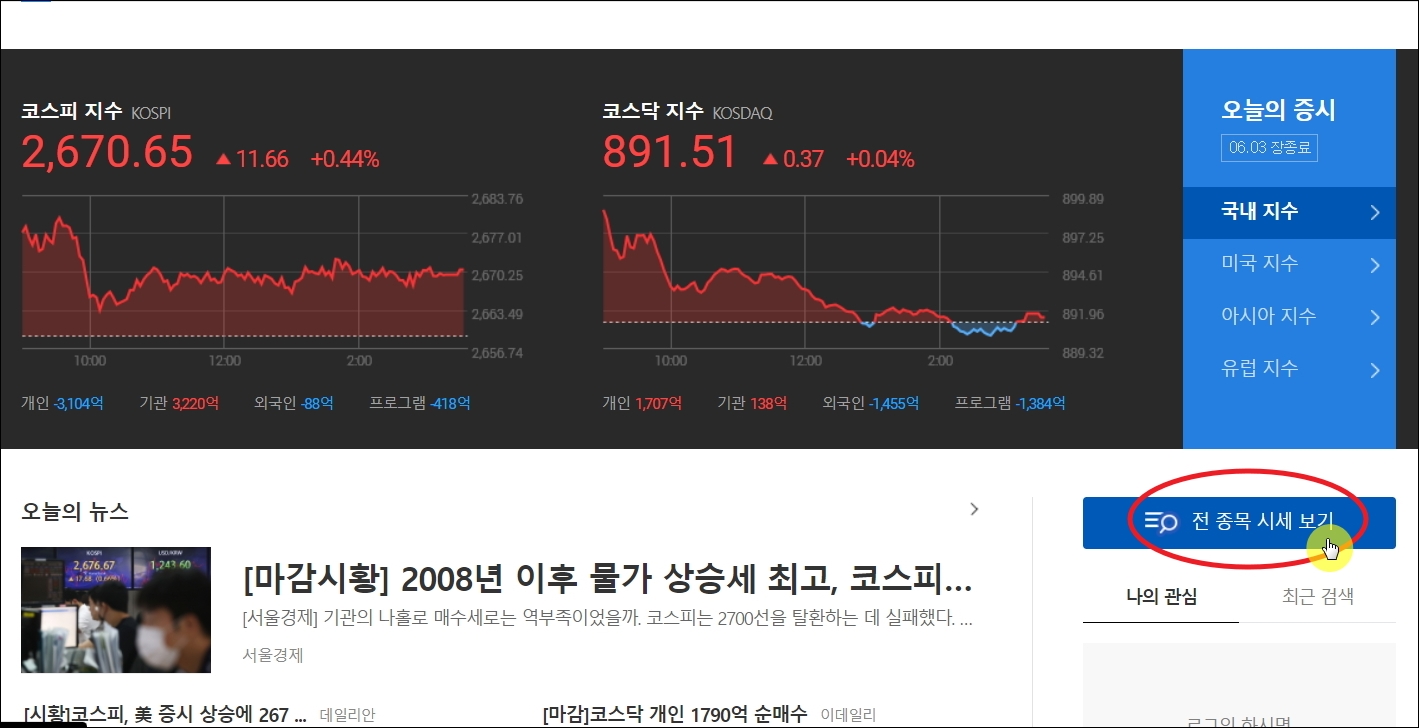 ▼다음의 증권 사이트에 접속했습니다. 가장 먼저 확인해야 할 것이 있습니다. 바로 오늘의 증시에 있는 국내 및 미국 지수입니다. 실시간으로 그려지는 그래프를 통해 증시 분위기를 쉽게 파악할 수 있도록 되어 있습니다. 사이트 화면 우측에 보면 [전종목 시세 보기] 버튼일 있습니다. 클릭해 보겠습니다.