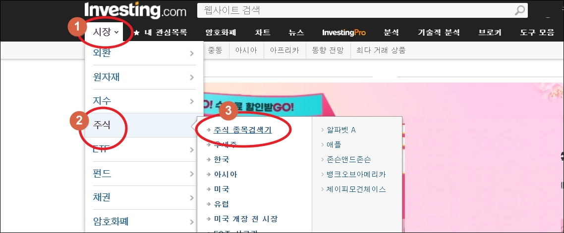 ▼인베스팅 사이트에 접속했습니다. 메뉴에서 [시장], [주식], [한국]를 순서대로 클릭합니다. [주식 종목 검색기]를 사용하는 것도 좋습니다.