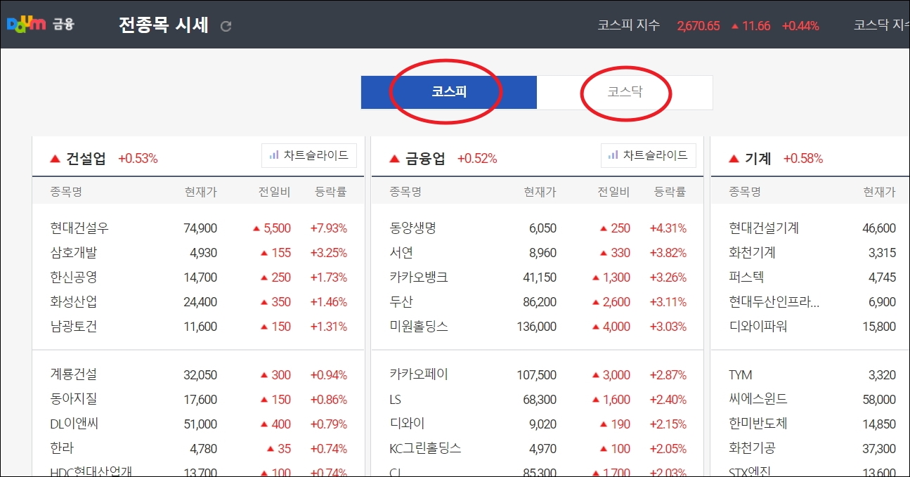 ▼실시간으로 국내 주식 시장의 모든 종목에 대하여 현재가, 전일비, 등락률을 볼 수 있는 페이지가 열렸습니다. 업종별로도 변동률이 표시되어 있기 때문에 어떤 업종이 잘나가는지 또는 좋지 않은지 파악하는 데에도 도움이 됩니다. 코스피는 물론이고, 코스닥 전종목 시세도 확인할 수 있습니다.
