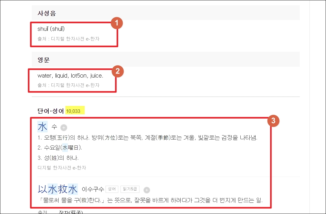▼마지막으로 사성음, 영문 표현, 관련 단어와 성어에 대해 알아볼 수 있습니다. "물 수"자 조회을 통해 해당 한자가 포함된 10,033건의 단어와 고사성어 정보를 얻을 수 있었습니다.